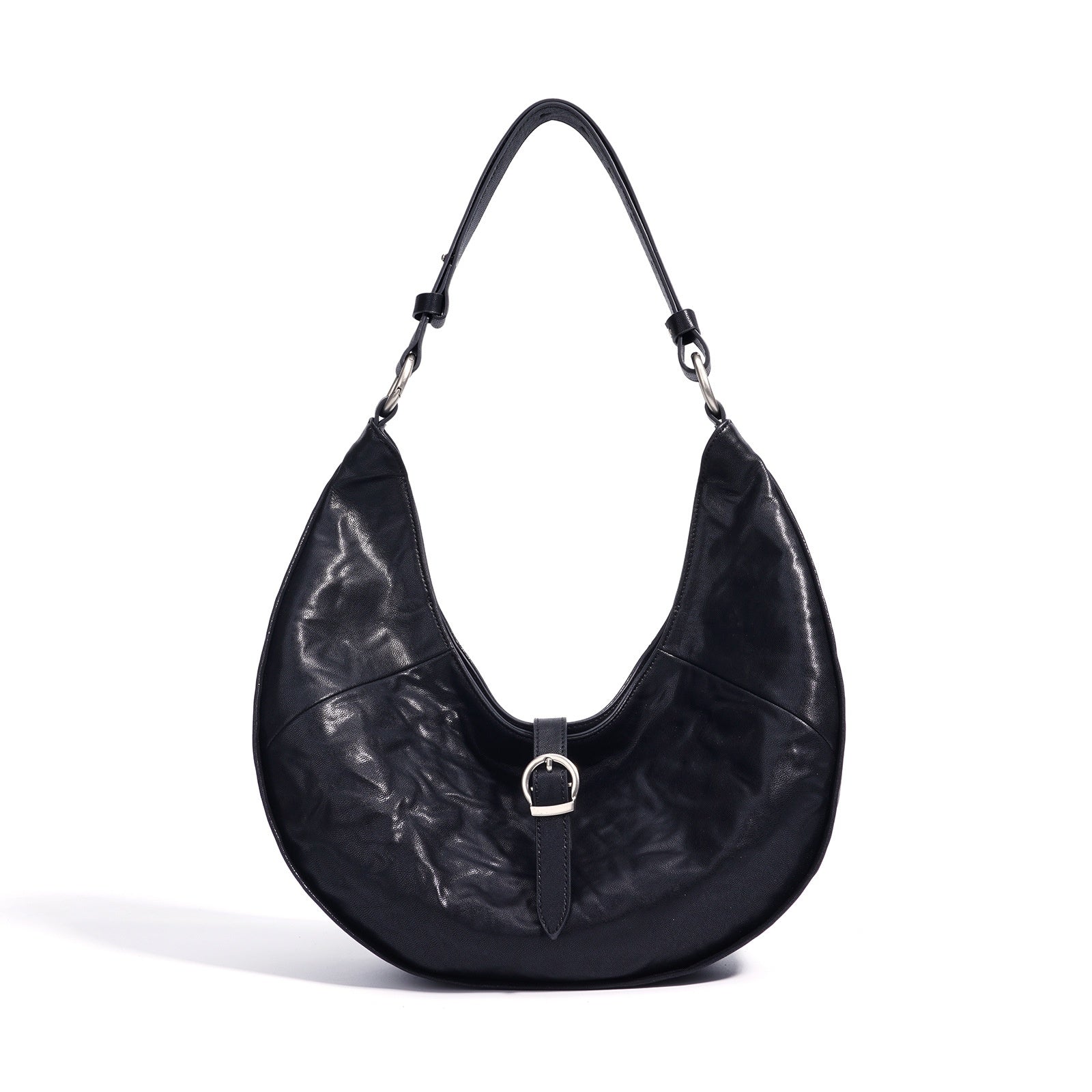 The Artemis Leather Hobo Bag is shaped from soft, pliable leather, creating a relaxed crescent form that rests comfortably against the body. Its minimal construction and unadorned surface draw focus to the material's gentle structure and smooth finish. For moments that call for an intuitive sense of ease.