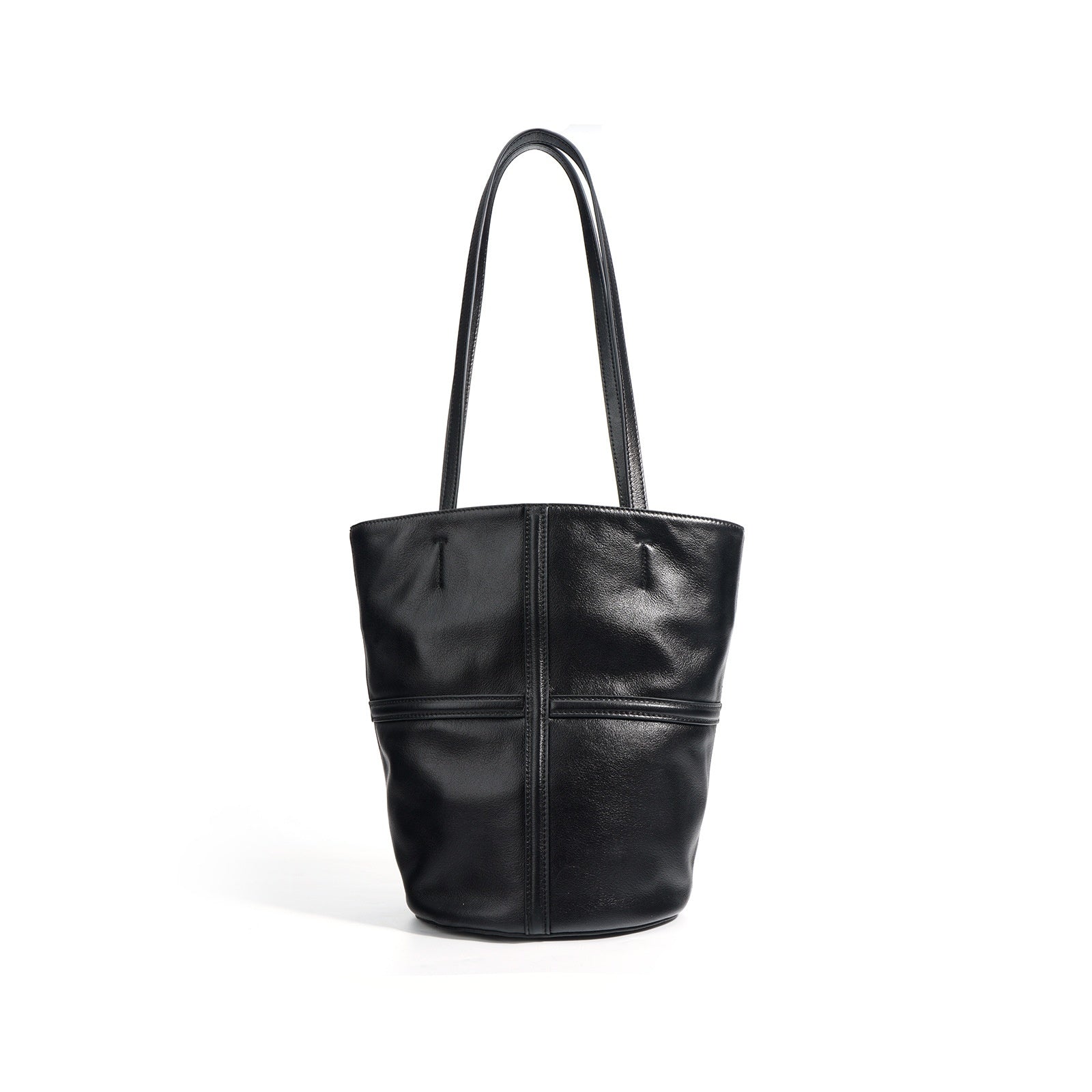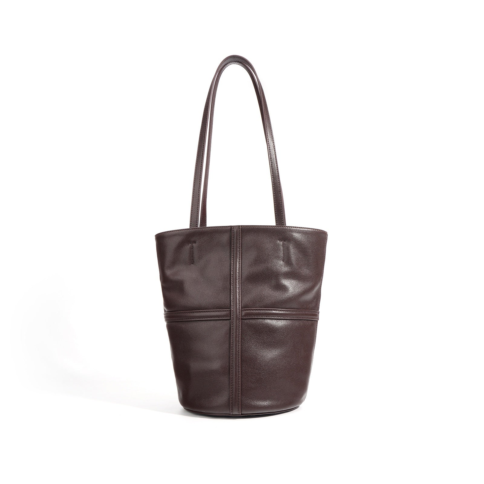 The Daniela Paneled Bucket Bag is a study in quiet construction. Precisely joined panels form a soft yet structured silhouette that rests on a defined circular base. A slender drawstring gathers the opening, securing the bag’s contents with a simple pull.