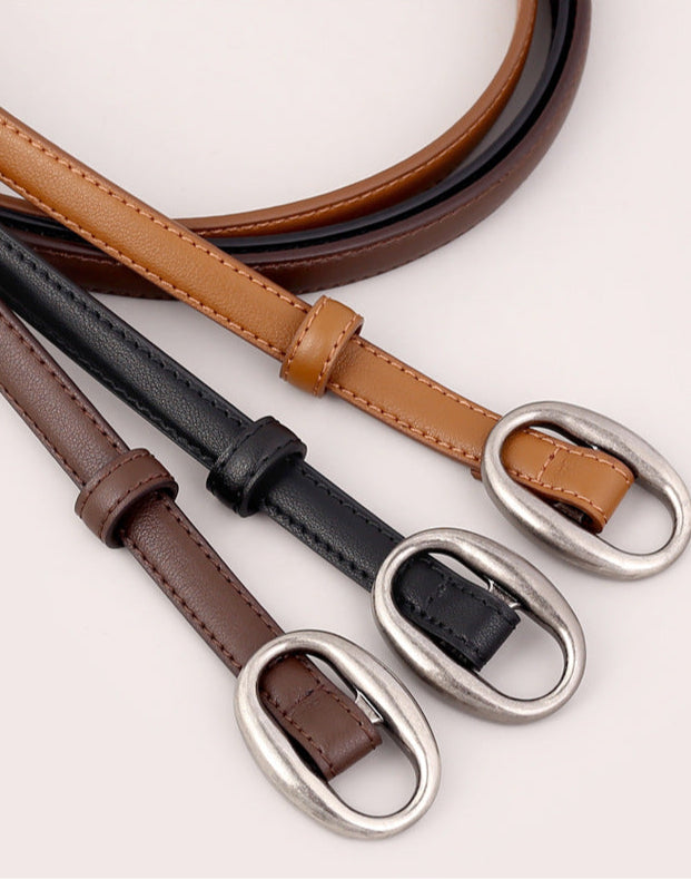 The Mallory Skinny Leather Belt, a piece from Vivanti, is crafted from supple leather with a visible natural grain. Its narrow strap threads through a clean-lined metal buckle, finished with precise stitching along the edge, resulting in a flexible form that sits with understated ease. It offers a considered finish for moments when form speaks softly.