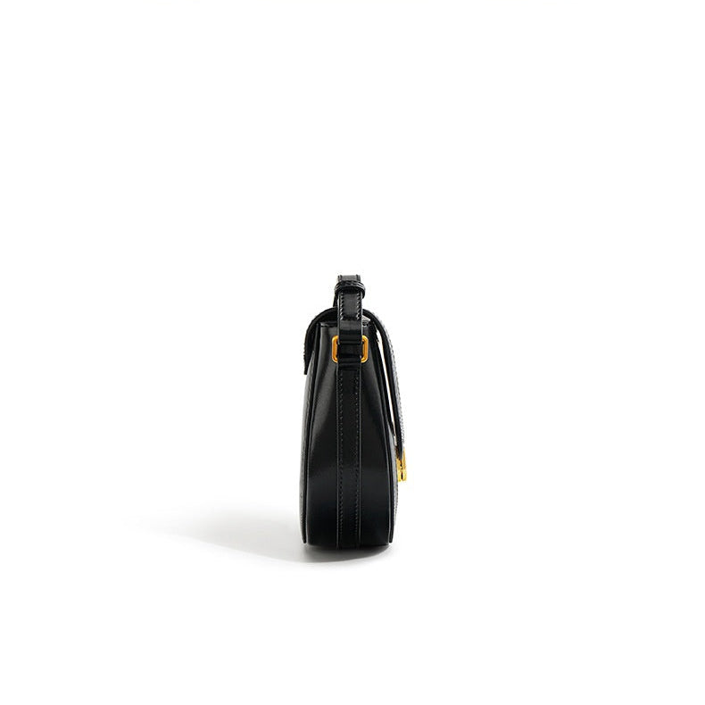 The Coco Leather Crossbody Saddle Bag is shaped from smooth, structured leather, defined by its classic curved silhouette. A clean, contoured flap folds over the front, while the slender strap adjusts for ease of wear. It is a quiet companion for days that ask for little more than the essentials.
