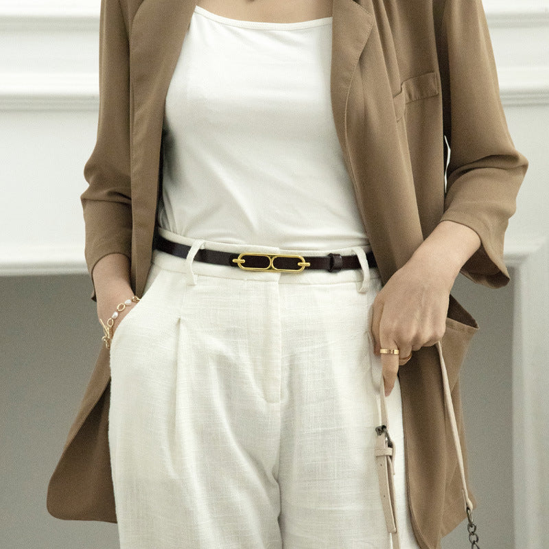 The Tara Skinny Leather Belt by Vivanti shapes the waist with a clean line. Rendered in smooth leather, its narrow profile moves with ease, securing simply with a quiet buckle, the metal holding its form. For moments that call for quiet composure.
